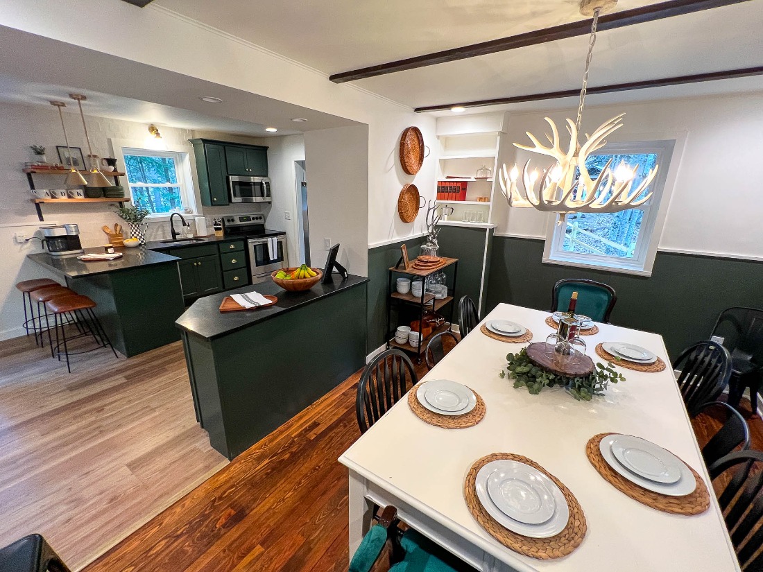 The main floor has a queen bedroom, full bath, walk-in shower, and wood-burning fireplace. Off of the dining room, this house offers a screened-in porch. Upstairs you will find one king bedroom with a master bath, two queen bedrooms, a full bath with a tub and a shower, and the fifth room featuring a twin bed and a twin over full bunk bed.