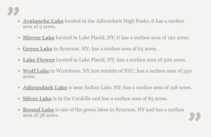 A body of water with the surface area of 220 acres is no joke. Hadlock Pond which is located in the Lake George area is roughly of that size. The well-known “Mirror Lake” in Lake Placid is similar in size. In fact, there are many lakes in New York State that are very similar in size to Hadlock. Here are a few you may have heard of: